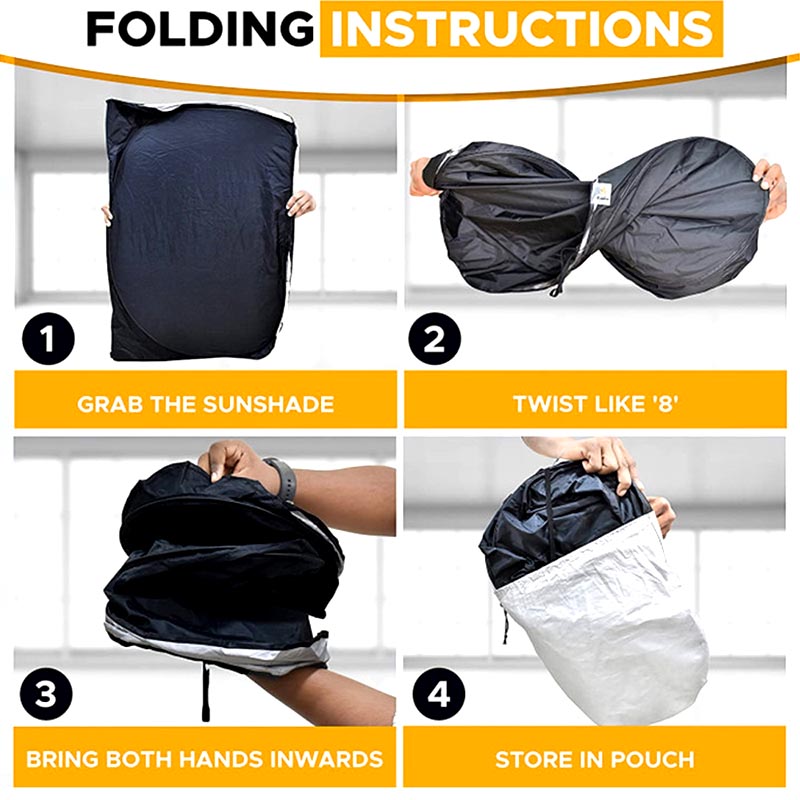 Fácil de usar e armazenar: O guarda-sol prateado de titânio tem um design simples, os usuários podem desdobrá-lo e instalá-lo facilmente no para-brisa dianteiro em segundos. Após o uso, é igualmente simples,basta dobrá-lo com cuidado,ocupa muito pouco espaçoe pode ser facilmente guardado no bolso da porta ou atrás do assento.